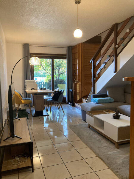 Résidence le Château, à proximité immédiate des commerces et transports, charmant T2 en rez de chaussée en duplex composé d'une entrée, une cuisine ouverte sur le séjour avec accès à une terrasse privative. A l'étage un toilette séparé, une salle de bains, une chambre avec placard et loggia. Une place de parking privative et une cave.