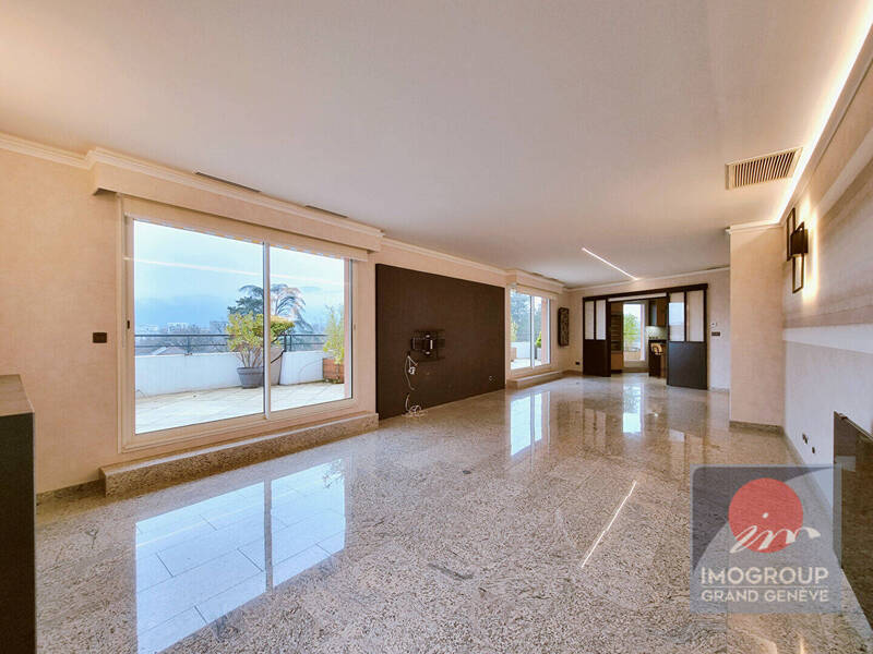L'ensemble des pièces de réception et des chambres ouvre sur une terrasse arborée de plus de 110 m² qui offre à la fois une vue féerique sur le Mont Blanc et un ensoleillement continu. La résidence calme est entièrement sécurisée avec espaces verts.